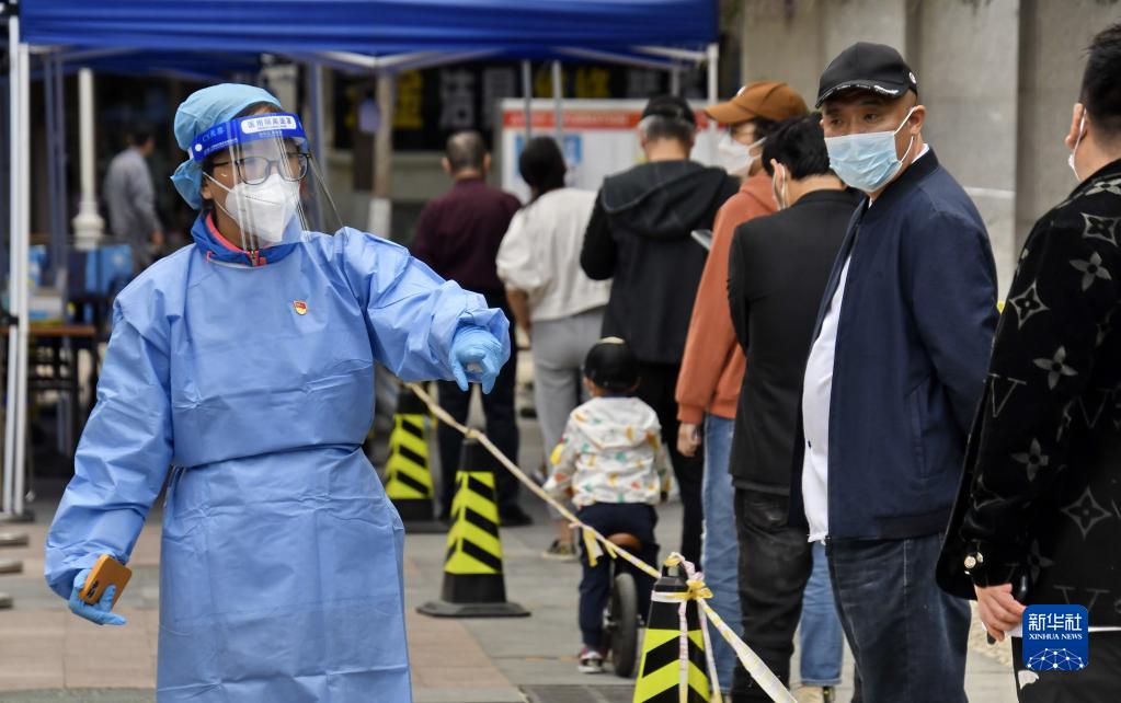 共產(chǎn)黨員、北京八里莊街道機關干部張茜(左)在核酸篩查現(xiàn)場進行秩序維護(2022年5月11日攝)。新華社記者 李欣 攝