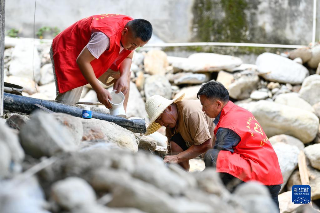 在貴州省黔東南苗族侗族自治州從江縣剛邊壯族鄉(xiāng)銀平村,黨員志愿者幫助遭受強降雨襲擊受災的村民修整水管(2022年7月1日攝)。新華社記者 楊文斌 攝