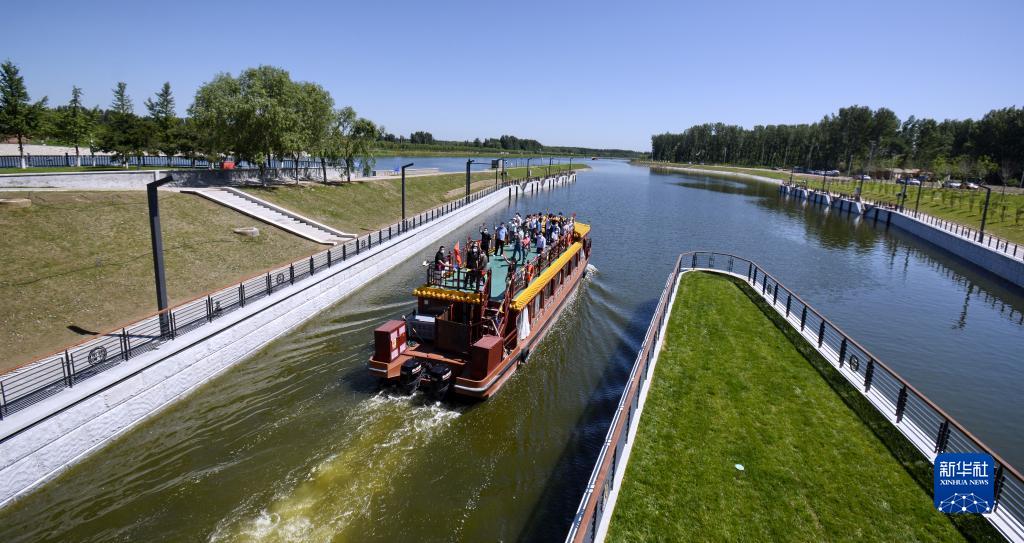 2022年6月24日,京杭大運河京冀段全線62公里實現(xiàn)游船通航。這是載著北京游客和建設者代表的游船通過船閘進入京杭大運河河北段。新華社記者 李欣 攝