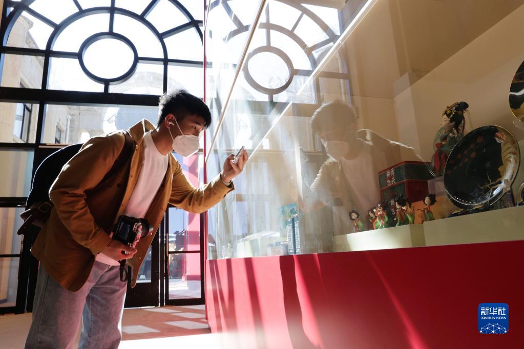 10月10日,觀眾在“奮進(jìn)新時(shí)代”主題成就展第五單元“堅(jiān)定文化自信 建設(shè)社會(huì)主義文化強(qiáng)國(guó)”展廳拍攝展示代表性非遺作品和文創(chuàng)精品的博古架。新華社記者 張玉薇 攝