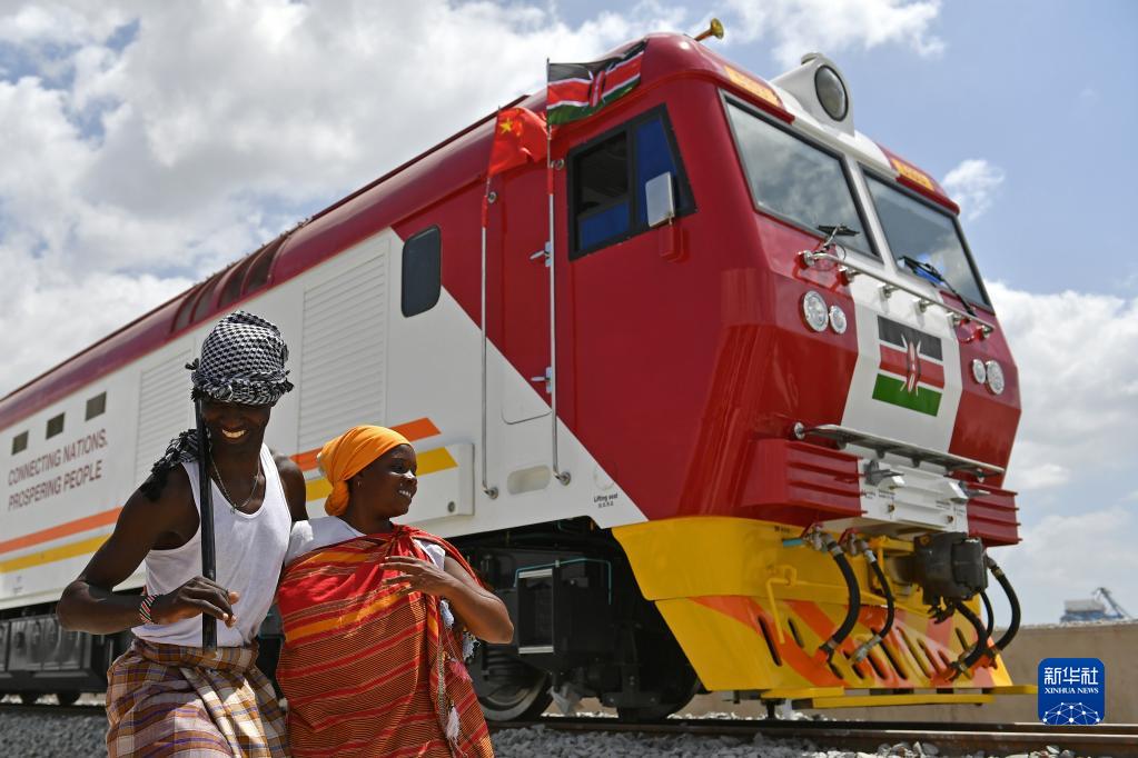 在肯尼亞蒙巴薩,當?shù)孛癖娫谥袊兄频拿蓛辱F路首批內燃機車旁載歌載舞(2017年1月11日攝)。新華社記者 孫瑞博 攝