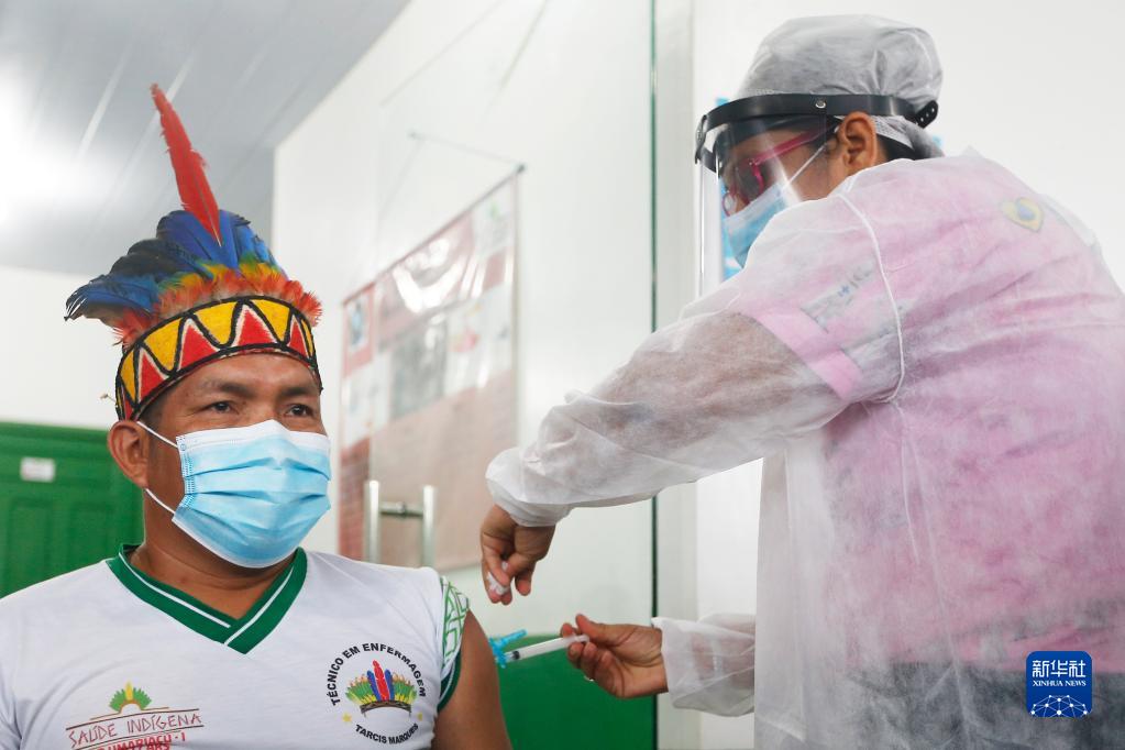 醫(yī)護人員在巴西亞馬孫州塔巴廷加市為一名原住民接種中國新冠疫苗(2021年1月19日攝)。新華社發(fā)(盧西奧·塔沃拉攝)