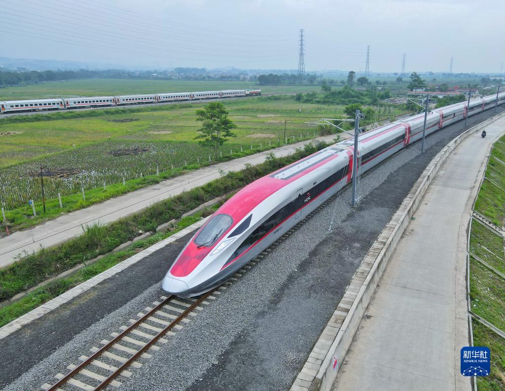 在印度尼西亞西爪哇省萬隆市,一列高鐵動車組正在雅萬高鐵試驗段進行熱滑試驗(2022年11月9日攝,無人機照片)。新華社發(fā)(李培養(yǎng)攝)