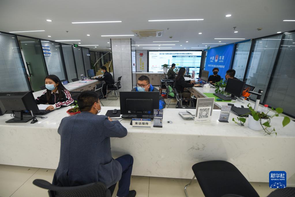 社區(qū)居民在浙江省湖州市吳興區(qū)飛英街道矛盾糾紛調(diào)處化解中心進(jìn)行咨詢登記(2022年4月28日攝)。新華社記者 徐昱 攝