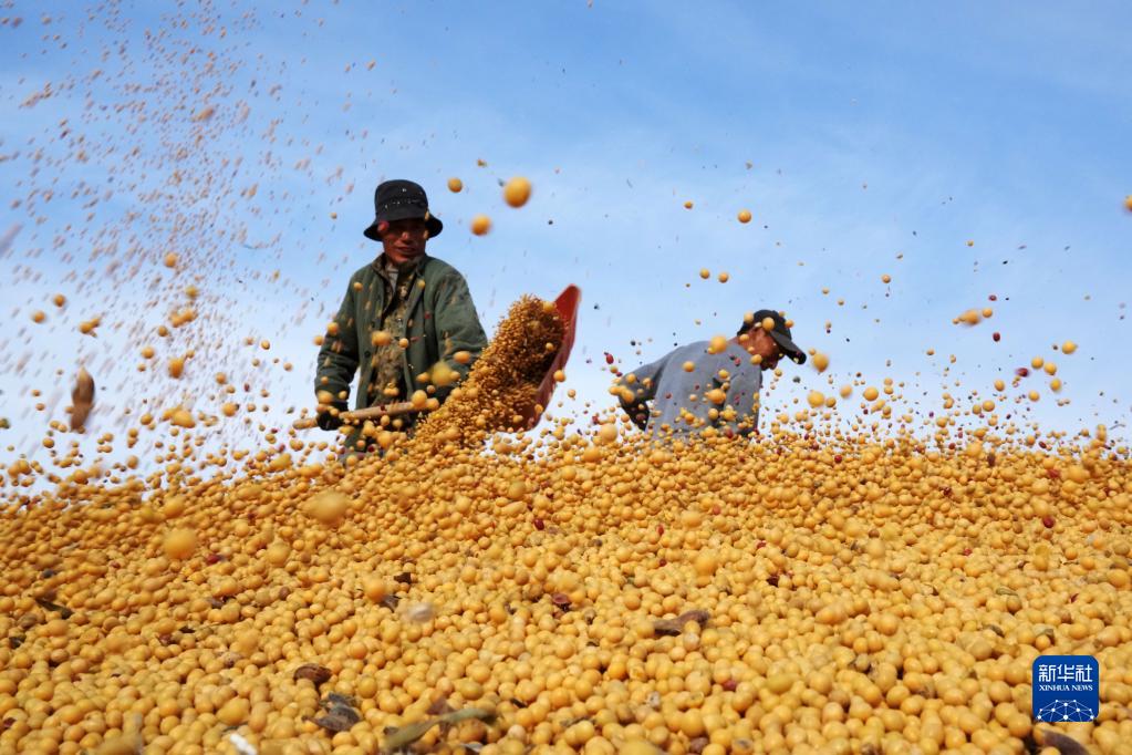 2022年10月20日,在北大荒農(nóng)墾集團有限公司北安分公司趙光農(nóng)場有限公司,工作人員在一處曬場的大豆堆上忙碌。新華社記者 王建威 攝
