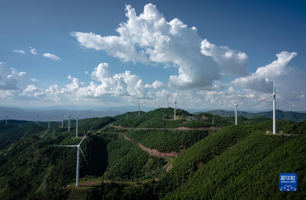 這是2022年8月18日在云南省楚雄彝族自治州姚安縣內(nèi)拍攝的風力發(fā)電機。新華社記者 王冠森 攝