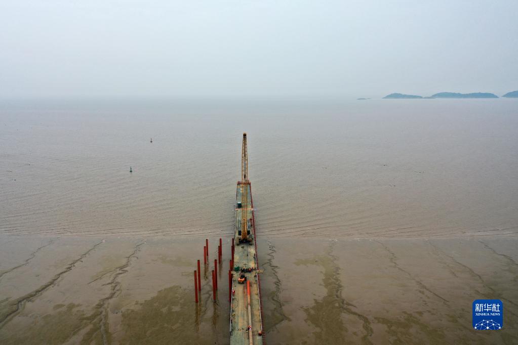 工程人員在通蘇嘉甬高鐵杭州灣跨海鐵路大橋施工現(xiàn)場鋪設(shè)棧橋,為后期工程做準(zhǔn)備(2023年2月1日攝,無人機(jī)照片)。2022年11月30日開工建設(shè)的通蘇嘉甬高鐵杭州灣跨海鐵路大橋全程跨海,總長約29.2公里,為設(shè)計時速350公里的雙線高速鐵路橋,是目前世界上在建長度最長、建設(shè)標(biāo)準(zhǔn)最高的高速鐵路跨海大橋。新華社記者 黃宗治 攝