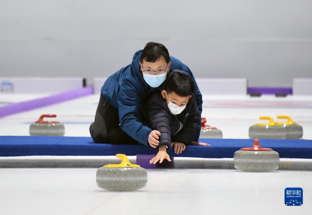 2023年1月23日,游客在“冰立方”冰上運動中心體驗冰壺運動。新華社記者 任超 攝