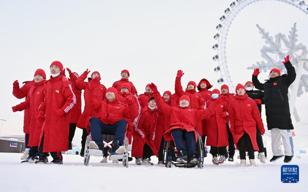 2023年2月9日,黑龍江省殘疾人后備運動員集訓(xùn)隊在第七屆中國殘疾人冰雪運動季北方主場活動現(xiàn)場合影。新華社記者 李賀 攝