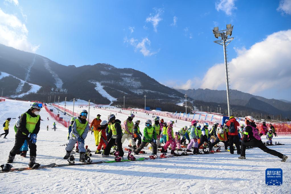 2023年1月11日,滑雪冬令營學(xué)員在陜西太白鰲山滑雪度假區(qū)教練的帶領(lǐng)下熱身。新華社發(fā)(鄒競一攝)