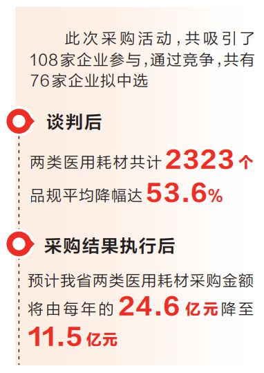 此次采購活動,共吸引了108家企業(yè)參與,其中,國內(nèi)企業(yè)70家、外資企業(yè)38家。通過前期充分調(diào)研,會中集中開標、兩輪談判等公平競爭環(huán)節(jié),共有76家企業(yè)擬中選。談判后,兩類醫(yī)用耗材共計2323個品規(guī)平均降幅達53.6%。采購結(jié)果執(zhí)行后,預(yù)計我省兩類醫(yī)用耗材采購金額將由每年的24.6億元降至11.5億元。