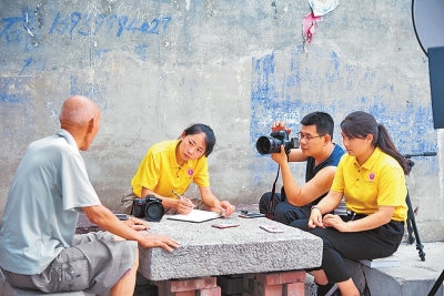 秦國防(右二)和學(xué)生們利用暑期到林州市任村鎮(zhèn)前莊,為修渠老人拍攝照片。李若瑜 攝