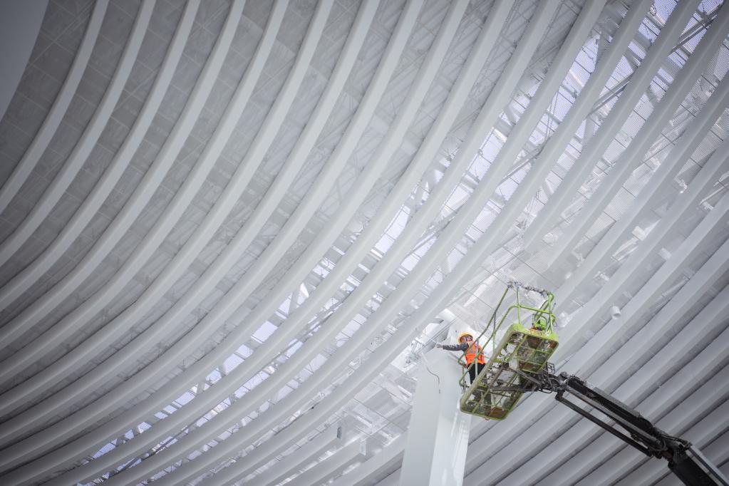 5月1日,在中建三局承建的武漢天河機(jī)場T2航站樓改造工程項目工地,工人檢查吊頂內(nèi)管線。新華社記者 伍志尊 攝