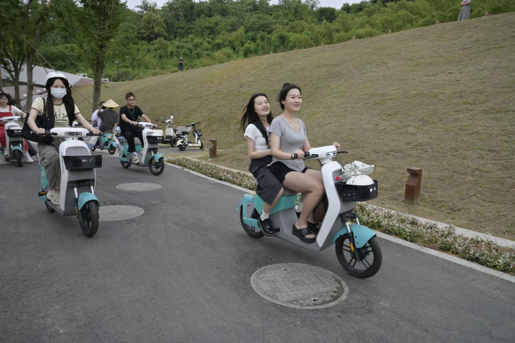 6月5日,在浙江省湖州市安吉縣天荒坪鎮(zhèn)余村,年輕人騎共享電動車游玩。新華社記者才揚(yáng) 攝