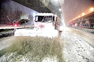 ??12月11日深夜兩點,鄭州市公用集團出動鏟雪車在北三環(huán)立交下除雪 正觀新聞·鄭州晚報記者 周甬 圖