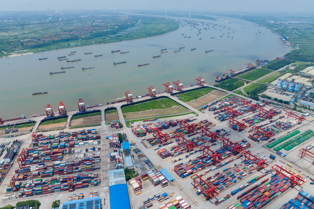 武漢陽邏港一期碼頭(2023年7月5日攝,無人機照片)。新華社記者 伍志尊 攝