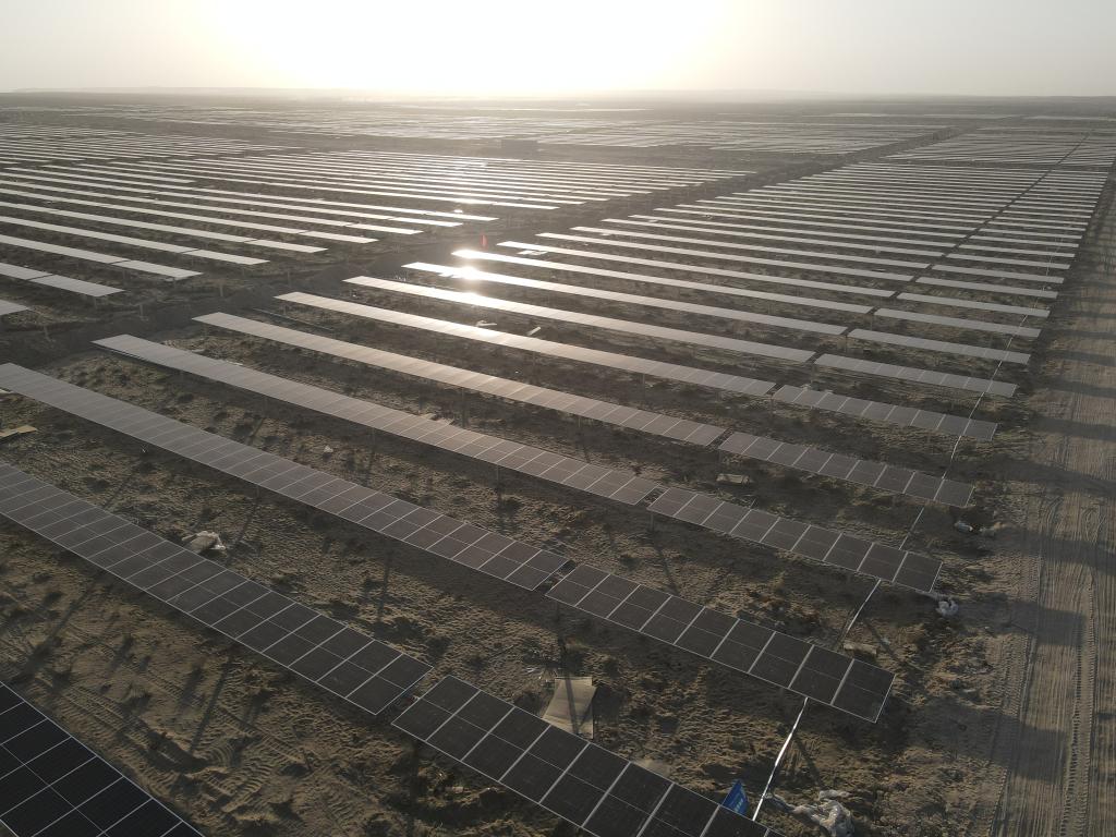 在烏茲別克斯坦卡什卡達(dá)里亞州和布哈拉州遼闊的大漠荒原上,太陽能光伏板列隊(duì)排布,在陽光映射下發(fā)出耀眼光芒。