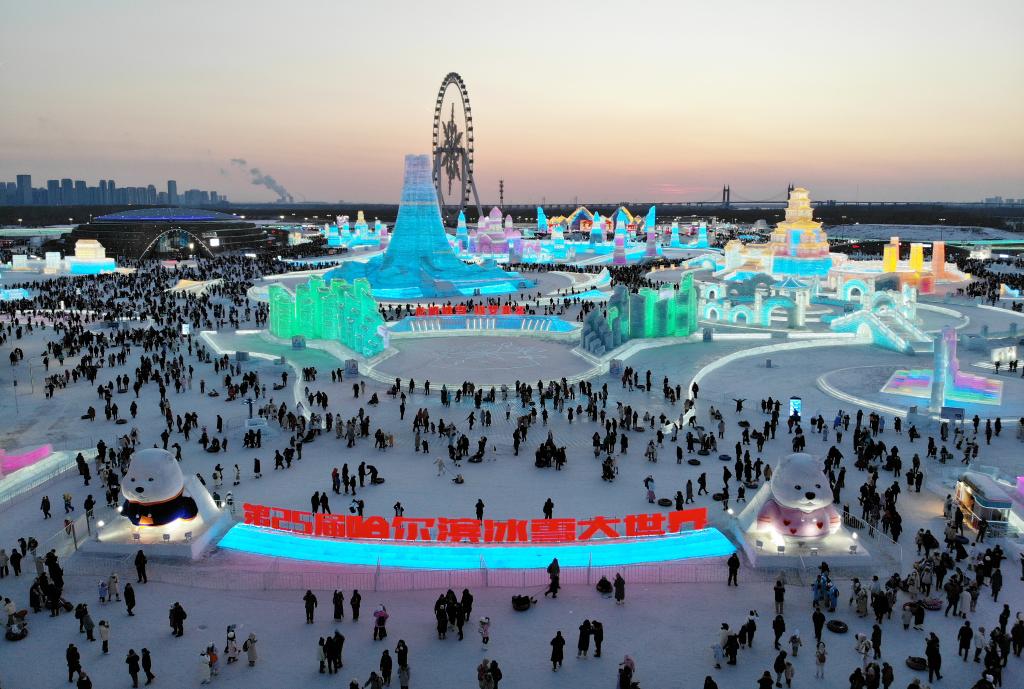 ??2月15日,游客在哈爾濱冰雪大世界園區(qū)內(nèi)游玩(無人機(jī)照片)。新華社記者 王建威 攝