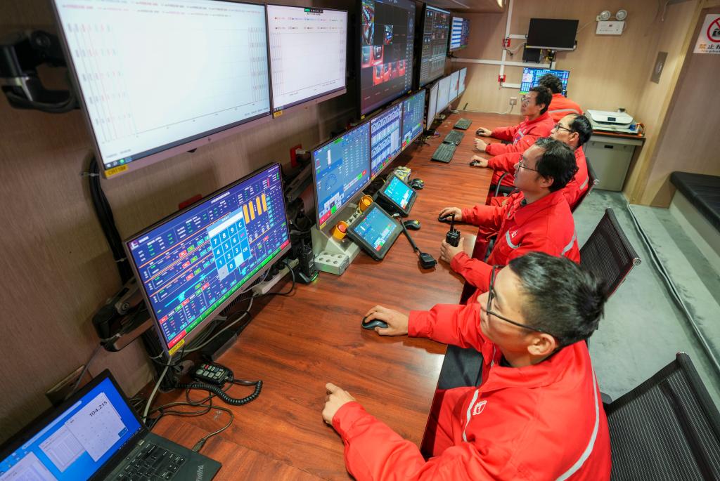 ??技術(shù)人員在重慶涪陵頁巖氣田焦頁5號(hào)電驅(qū)壓裂平臺(tái)控制室作業(yè)。