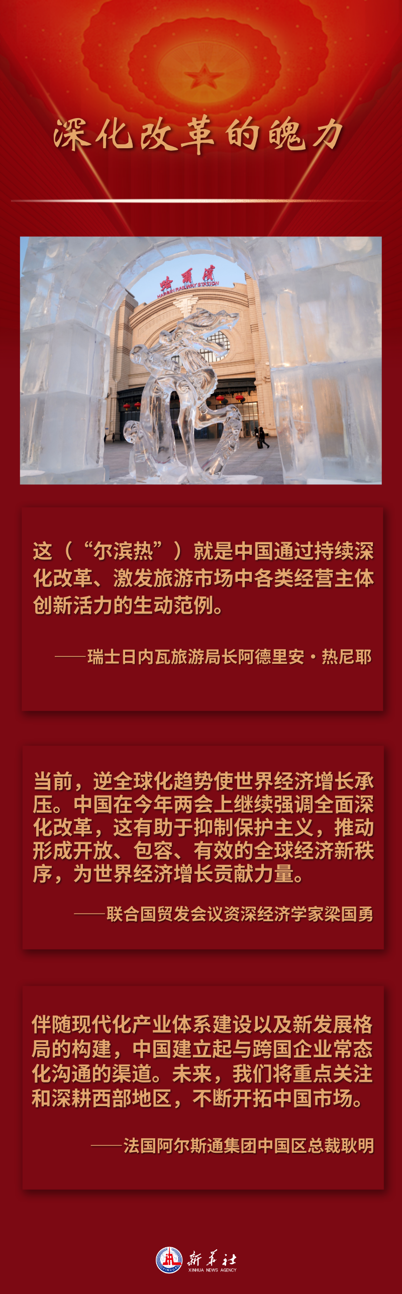 ??今年年初,“爾濱熱”火出國(guó)門,引來(lái)歐洲冰雪勝地瑞士旅游部門的“隔空互動(dòng)”。瑞士日內(nèi)瓦旅游局長(zhǎng)阿德里安·熱尼耶說(shuō),這就是中國(guó)通過持續(xù)深化改革、激發(fā)旅游市場(chǎng)中各類經(jīng)營(yíng)主體創(chuàng)新活力的生動(dòng)范例?!拔液芘宸枮I,政府能與整個(gè)市場(chǎng)一同努力挖掘冰雪旅游資源、改革完善相關(guān)機(jī)制,讓冬季活動(dòng)變得如此多彩!”