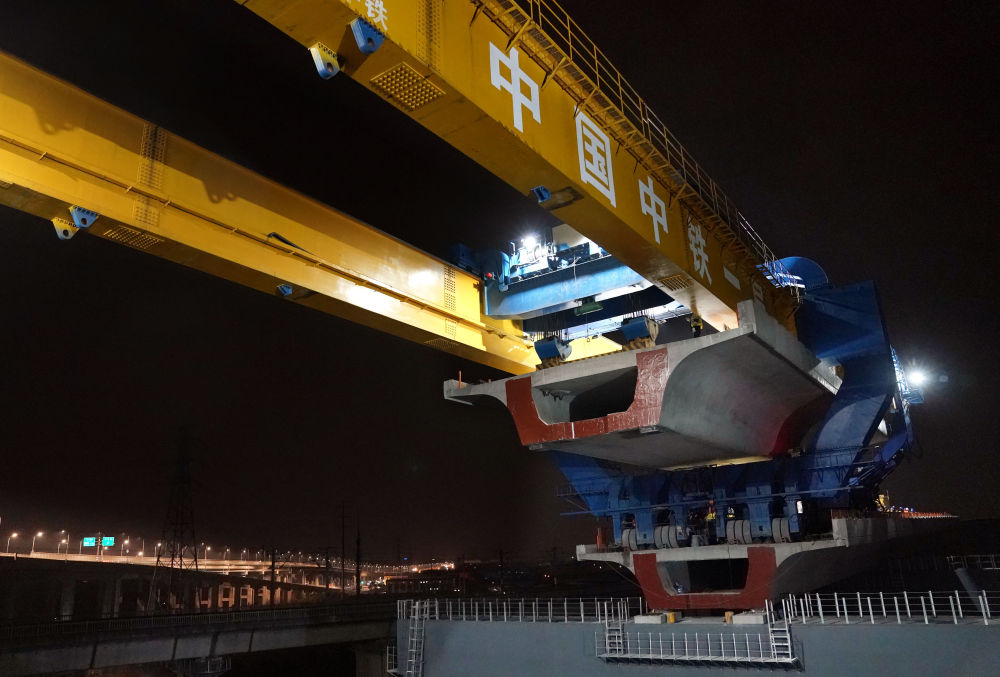 ??這是2024年3月4日凌晨拍攝的滬蘇湖鐵路全線最后一榀箱梁架設施工現(xiàn)場。當日,滬蘇湖鐵路全線箱梁架設完成。