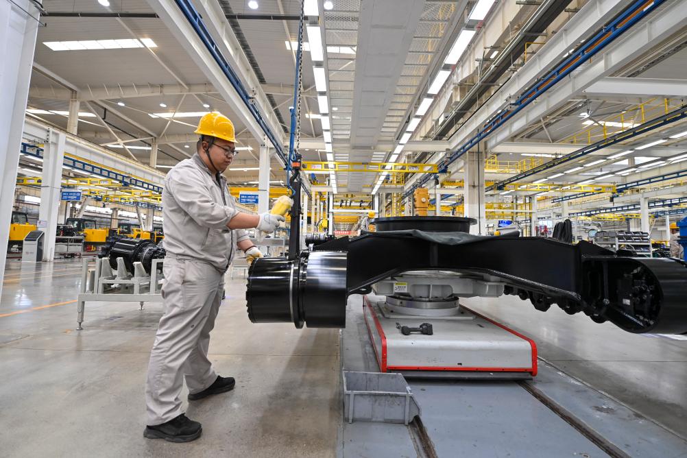 ??4月9日,工作人員在太重集團智能高端液壓挖掘機產(chǎn)業(yè)園區(qū)內(nèi)的智能生產(chǎn)線上作業(yè)。新華社記者 楊晨光 攝