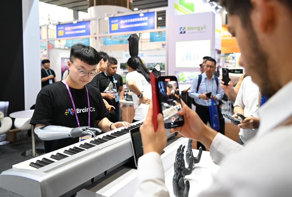 ??4月17日,佩戴智能仿生手的參展商工作人員在第135屆廣交會第一期“智慧生活”專區(qū)強腦科技展臺演奏電子琴。新華社記者 鄧華 攝