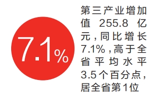 ??分產(chǎn)業(yè)看,三次產(chǎn)業(yè)增加值增速全面領(lǐng)先。第一產(chǎn)業(yè)增加值18.4億元,同比增長(zhǎng)2.9%,高于全省平均水平0.3個(gè)百分點(diǎn),居全省第4位;第二產(chǎn)業(yè)增加值189.2億元,同比增長(zhǎng)11.7%,高于全省平均水平5個(gè)百分點(diǎn),居全省第2位;第三產(chǎn)業(yè)增加值255.8億元,同比增長(zhǎng)7.1%,高于全省平均水平3.5個(gè)百分點(diǎn),居全省第1位。(記者 李宗寬)