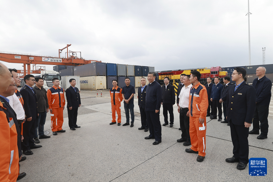 ??4月22日至24日,中共中央總書記、國家主席、中央軍委主席習近平在重慶考察。這是22日下午,習近平在重慶國際物流樞紐園區(qū)重慶鐵路集裝箱中心站考察。新華社記者 岳月偉 攝