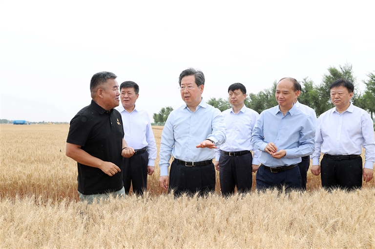 長葛市石象鎮(zhèn)的高標準農(nóng)田里,金色的麥浪起伏蕩漾,聯(lián)合收割機穿梭奔忙,一派燦爛豐盈的喜人景象。樓陽生走進麥田、揉開麥穗,察看麥粒飽滿程度,與農(nóng)戶、農(nóng)機手親切交流,了解播種面積、麥收進度、收成收入等。他指出,春爭日、夏爭時,要密切關(guān)注天氣變化,搶抓麥收有利窗口期,加強跨區(qū)機收組織調(diào)度,提升機械化、智能化水平,確保應收盡收、顆粒歸倉。在河南鼎優(yōu)農(nóng)業(yè)科技有限公司,樓陽生走進新品種展示中心,了解玉米、瓜果、蔬菜等新品種培育種植情況,鼓勵企業(yè)不僅要培優(yōu)種好新品種,還要往深加工走,拉長產(chǎn)業(yè)鏈、提高附加值。在聽取企業(yè)人才引育情況匯報后,他指出,發(fā)展現(xiàn)代農(nóng)業(yè)離不開一支高素質(zhì)農(nóng)業(yè)從業(yè)者隊伍,要加強產(chǎn)業(yè)扶持、政策支持,培育引導更多愛農(nóng)業(yè)、有知識、懂技術(shù)、善經(jīng)營的新農(nóng)人,投身農(nóng)村廣闊天地大展身手。