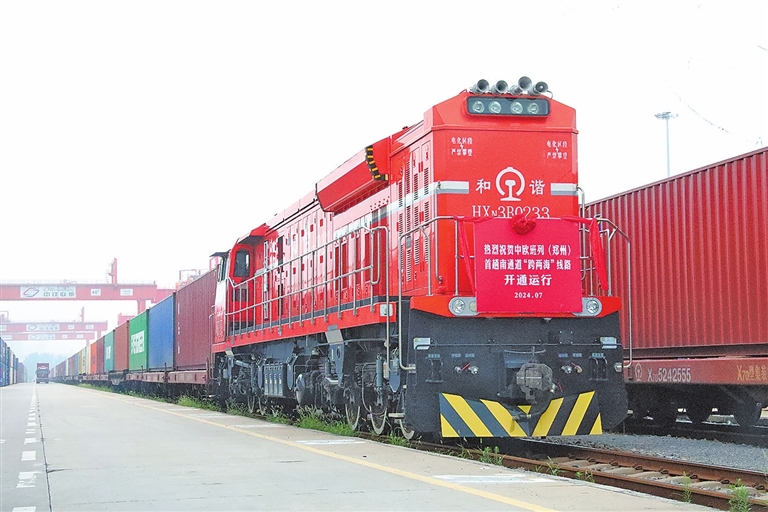 這趟班列踏上的是一條新征程,標(biāo)志著中歐班列(鄭州)南通道“跨兩?!本€路開通運(yùn)行。