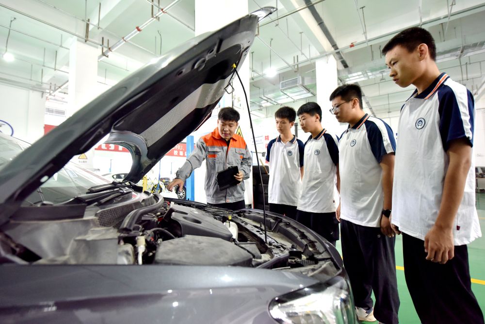 ??2024年6月7日,河北省邢臺市威縣職業(yè)技術(shù)教育中心教師在指導(dǎo)學(xué)生學(xué)習(xí)汽車維修技術(shù)。新華社記者 王曉 攝