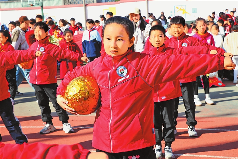10月24日,焦作市解放區(qū)幸福街小學(xué)學(xué)生正伴隨著音樂跳自編的韻律操。自秋季新學(xué)期開學(xué)以來,該區(qū)開展形式多樣、內(nèi)容豐富的特色體育教學(xué)活動(dòng),自編自創(chuàng)體育活動(dòng)項(xiàng)目,讓學(xué)生們通過別樣的體育活動(dòng)強(qiáng)健體魄。李良貴 攝