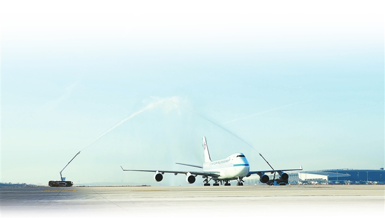 12月22日,中原龍浩航空B747全貨機(jī)從印度金奈飛抵鄭州,兩條銀色的水柱噴射而出,形成一座“水門”,向這架飛機(jī)致以民航界最高禮儀。 姚自力 攝